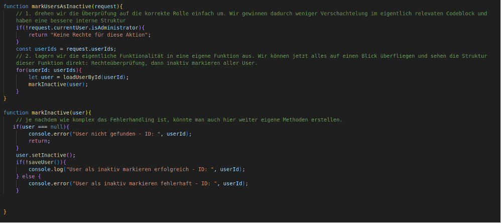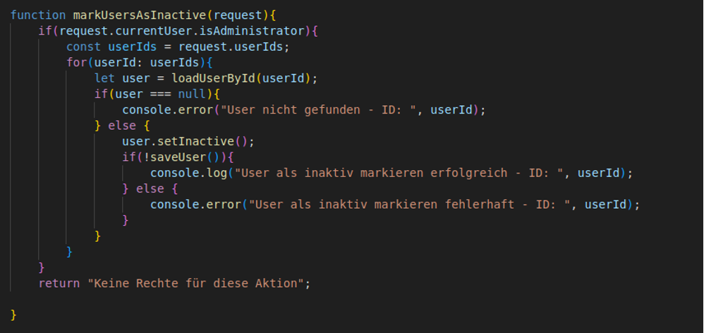 Zuerst werden Rechte abgefragt. Wenn diese korrekt sind, wird die eigentliche Funktionalität abgearbeitet. Wir können zudem grob sehen, was die Funktion tun soll, ohne dabei genau wissen zu müssen, was markInactive eigentlich fachlich bedeutet.