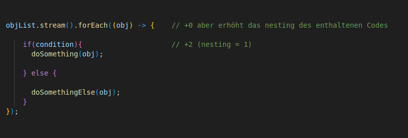 Auch Streams werden nicht bewertet, da sie üblicherweise sehr einfach zu lesen sind – selbst wenn viele Operatoren aneinander gekettet sind. Sie erhöhen allerdings den nesting score für den Code in ihnen.