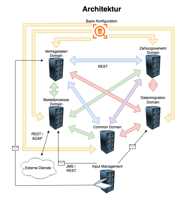 - Kommunikation zwischen Säulen erfolgt ebenfalls über REST, teils ergänzt durch SOAP-Anbindungen zu externen Diensten (z. B. Validierung von Vertrags- oder Kundendaten).
